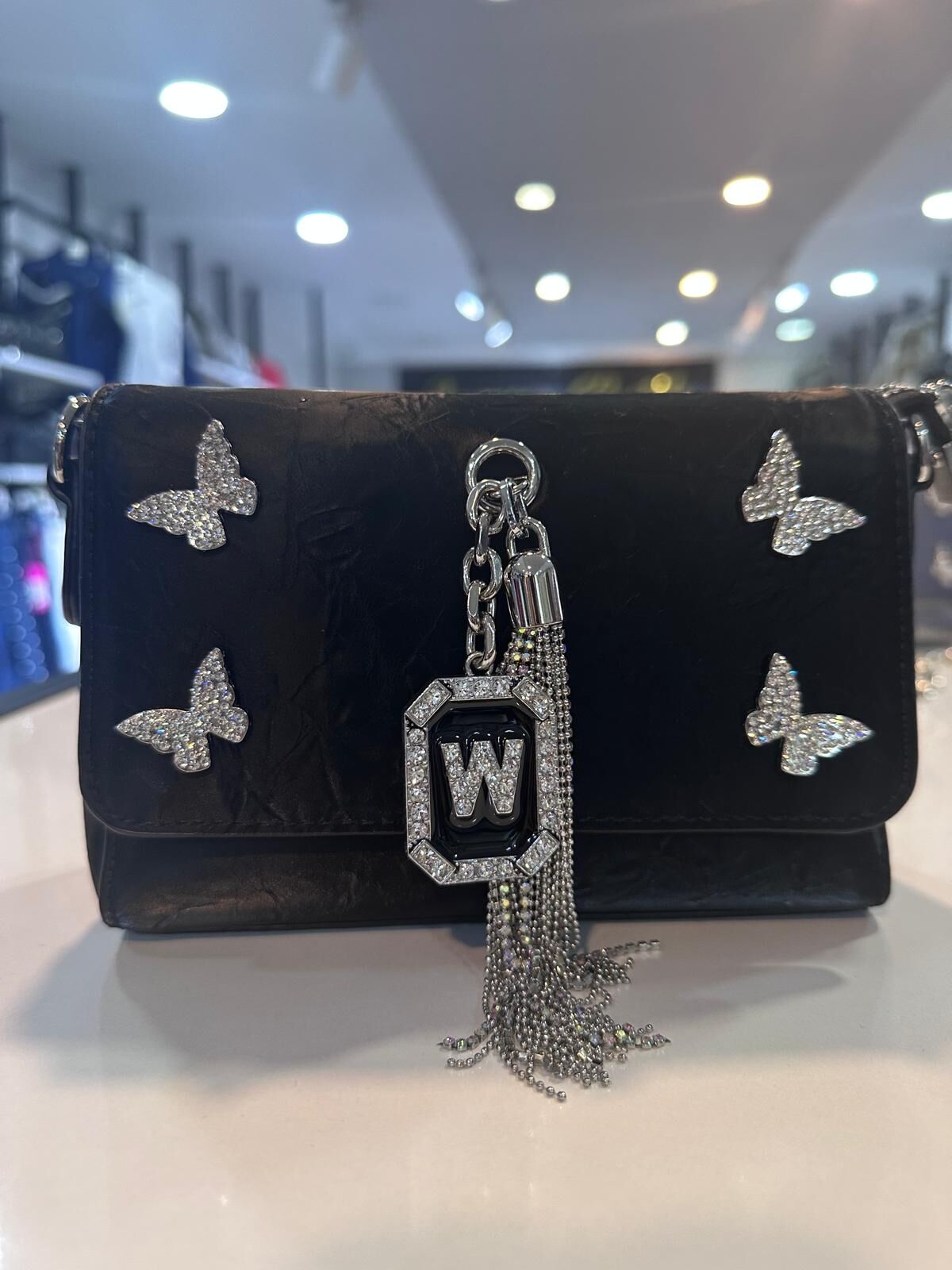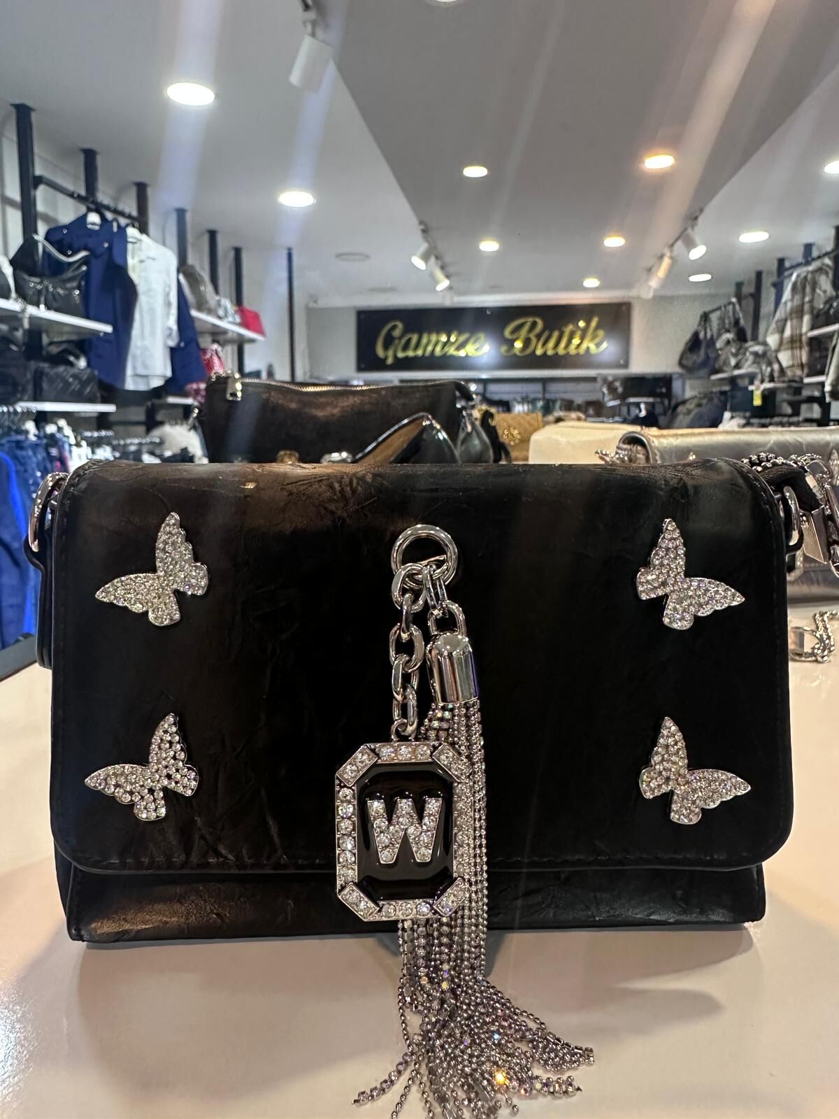 Suni deri olup, kelebek şeklinde taş detayları mevcuttur. (Parlak suni deri.)